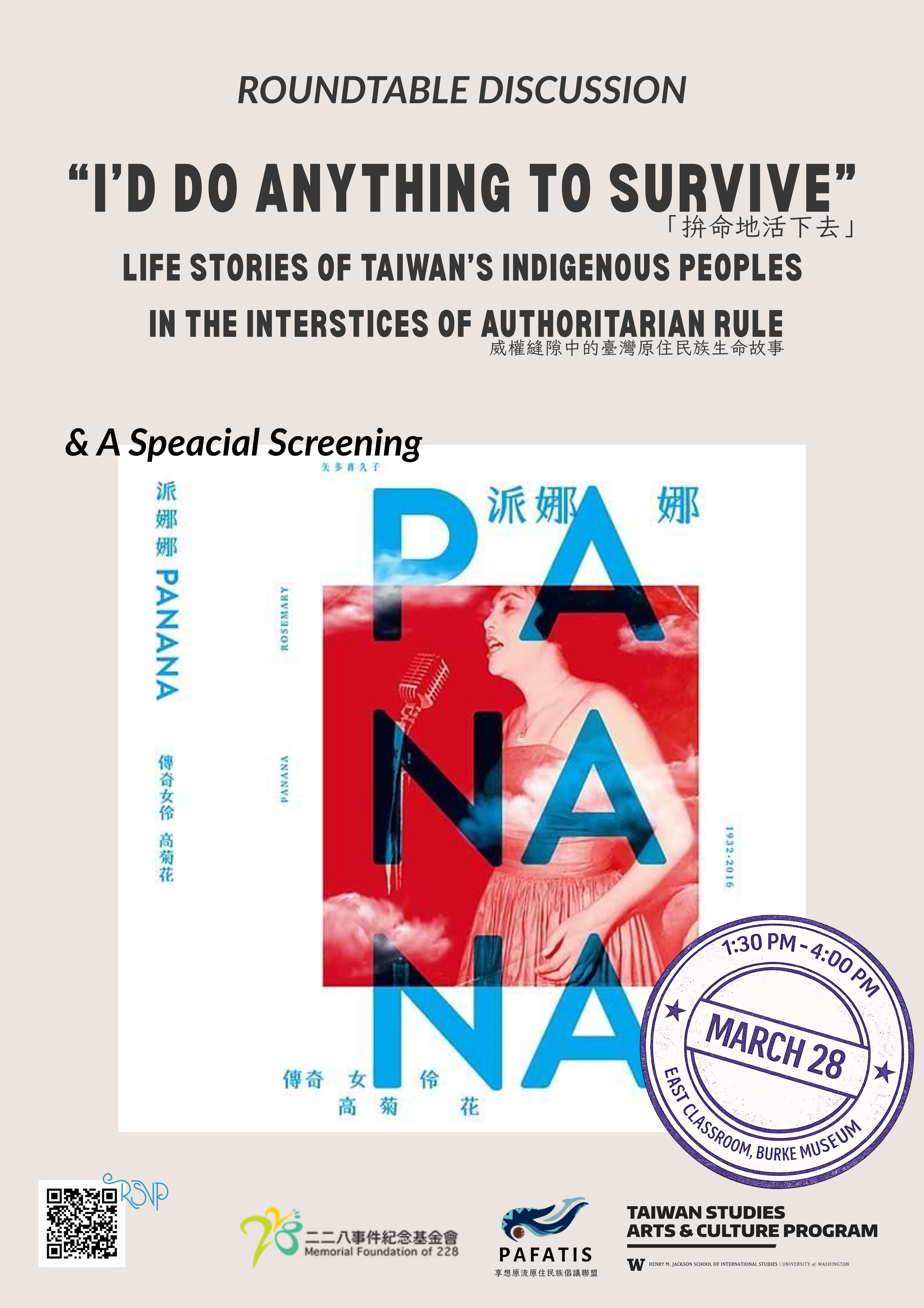 本次放映座談由 PAFATIS 、UW Taiwan Studies Program 與二二八紀念基金會合辦,我們將透過野火樂集拍攝的紀錄片《傳奇女伶 高菊花》,回溯吾雍的長女高菊花女士跌宕而堅忍的人生。現場將放映紀錄片《傳奇女伶 高菊花》之影音紀錄,重現高菊花女士生前留下的珍貴影像,並透過她的親自口述及親友訪談,邀請觀眾深入思考白色恐怖與族群的交互脈絡,看見威權時代原住民族的生命經驗,以及威權統治對個人及群體留下的長遠影響。放映後,我們將與林慧年教授(國立屏東大學文化發展學士學位學程原住民專班)、藍士博執行長(二二八事件紀念基金會)進行與談。